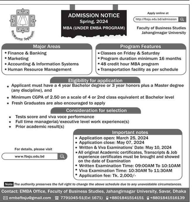 Faculty of Business Studies Jahangirnagar University has published ADMISSION NOTICE SUMMER, 2024 for MBA (EMBA PROGRAM)