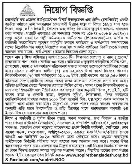 Society for Project Implementation Research Evaluation and Training (SOPIRET) is inviting application from the candidates for the post Field Officer.
