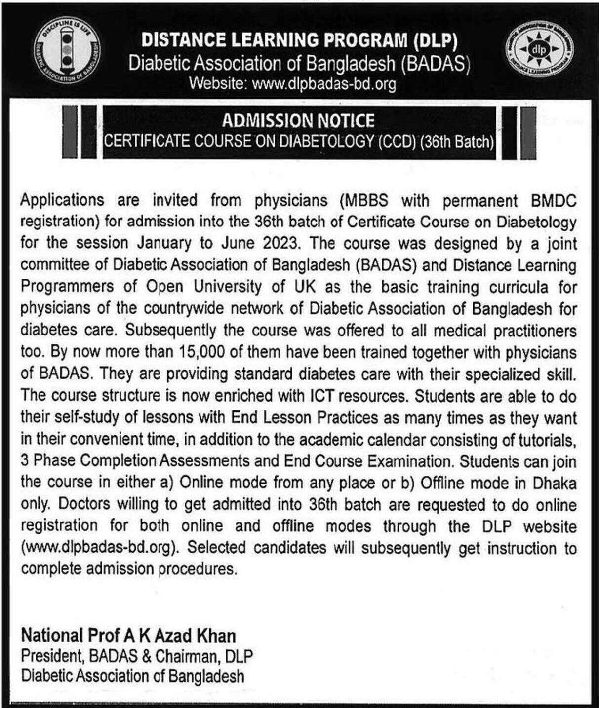 Considering the gravity of the situation, Bangladesh Diabetic Association is offering Certificate Course on Diabetology through their Distance Learning Program. It is their 36th offering for the session January-June, 2023. It is a collaborative program with the distance learning program of Open University of United Kingdom. This certificate course is recognized by International Diabetes Federation.