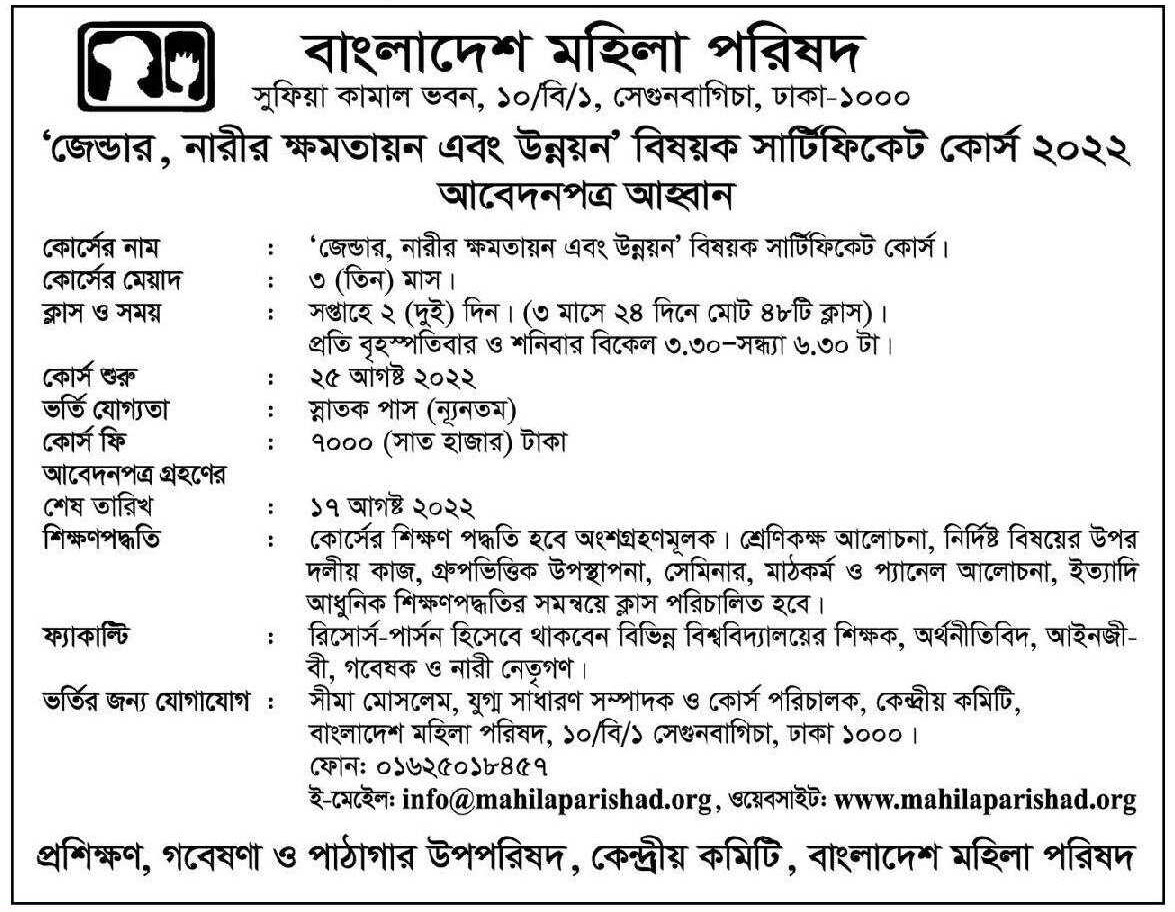 Bangladesh Mahila Parishad is inviting applications from the candidates for online certificate courses on Gender, Women's Empowerment and Development.